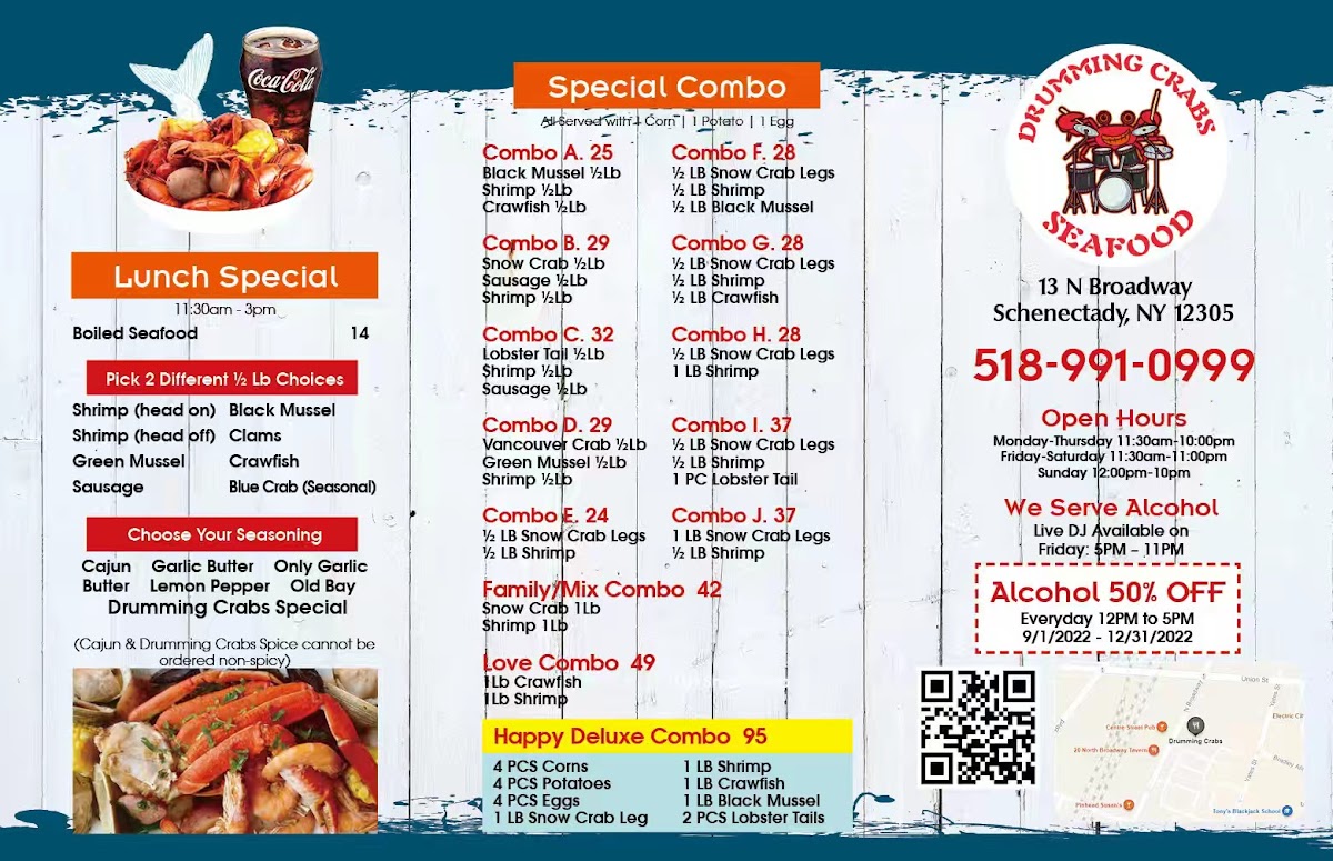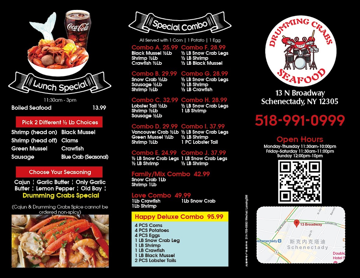Introducing the menu at Drumming Crabs, a delightful seafood haven in Schenectady, NY. This culinary gem offers a variety of mouthwatering dishes that cater to seafood lovers and comfort food enthusiasts alike. Their lunch combos feature tender chicken, beef, or shrimp tossed with fresh broccoli or vibrant vegetables, all at an affordable price of US$11.00 per combo.
